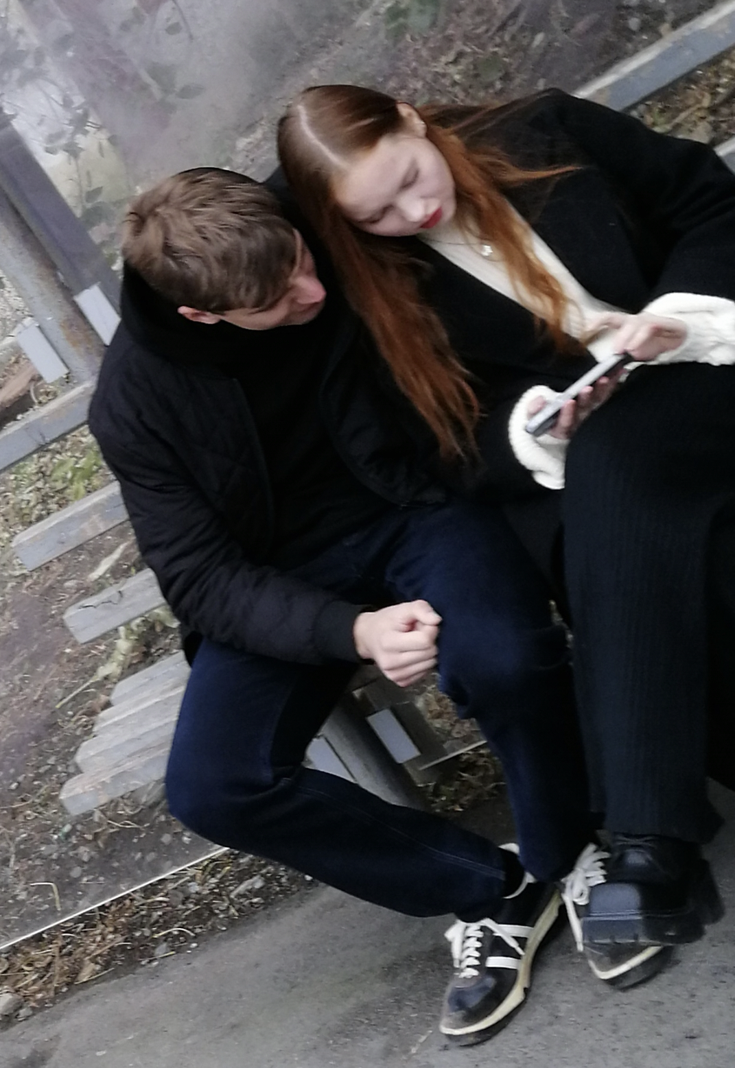 Очередная парочка ОТБРОСОВ! Ну, как обычно, стою я, жду скотовозку — надо занять всю скамейку и гыгыкать под видосики, сидя в обнимку. Мразота! Я терпел холодный ветер, пока они там сидели рядом!