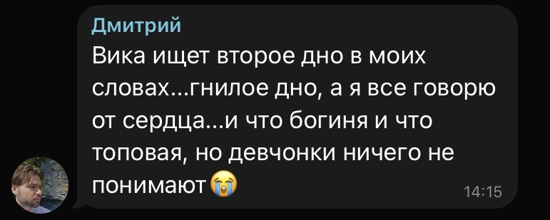 >>25416329 > Держит обидку уже столько времени и говна в ответку вылил кучу. Потому что ему Афродита и 30летний недоактёр наговорили историй и подкинули фактов про их бывшего дружка. Без них Саня даже не обращал внимание на Артура.