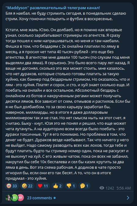 Пока ночь есть идея. Парни, хули мы хуйней занимаемся? Нам надо устроить сходку и кое-что решить. Выдвигаю идею создания ОПГ рекламного агентства. Тут же много умных чуваков типа меня. Аринера назначаем раскручивать Арину, Арадауна назначаем за Женьком, и так далее. Остальной кусок пирога идёт чумоданам, согласны? Подкрепим всё рекламой, договоримся с буками. Главное чтобы нас было много и мы имели устрашающий вид. Нормальная идея? Это реальнейшая тема сейчас, квартиры в Лондоне и Париже, хуле вы ссытесь? Мне нужны сообщники. Главное собраться на сходку.