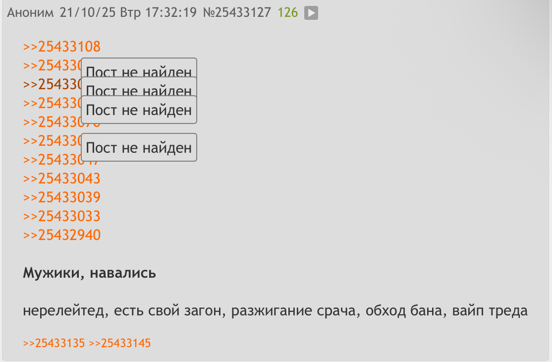 >>25432940 >>25432955 обход бана, нерелейтед, шитпостинг, разжигание срача, есть свой загон