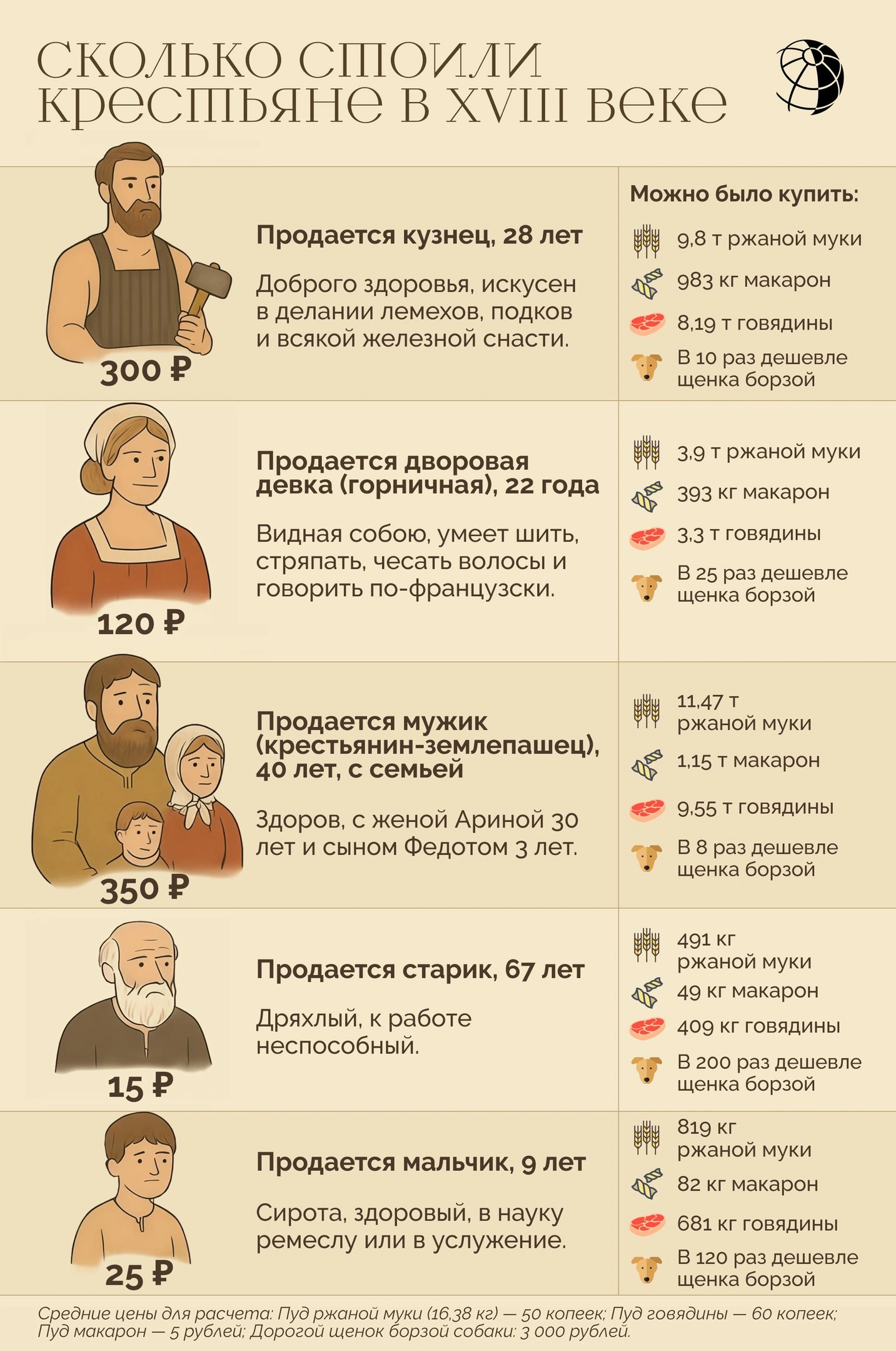 >Что касается борзых, то в воспоминаниях о XVIII веке, опубликованных в журнале «Русская старина» в 1880-м говорилось: «Один помещик продавал девушек-невест по 25 рублей, другой в то же время покупал борзых щенков по 3 000 рублей. Стало быть, щенок, даже не собака, ценился в 120 раз дороже человека, или 120 девок равнялись одной суке»