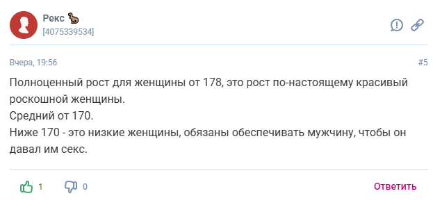 Про рост парней вообще не нужно писать, так как он не имеет никакого значения. А вот женщина, чтобы считать её именно красивой и уж тем более роскошный, должна быть хотя бы от 178. Сейчас много прямо совсем молоденьких девчуль реально высокие, с очень красивыми пропорциональными фигурками и женскими формами, настоящие красотки! Разумеется, карлицы ниже 170 им завидуют!