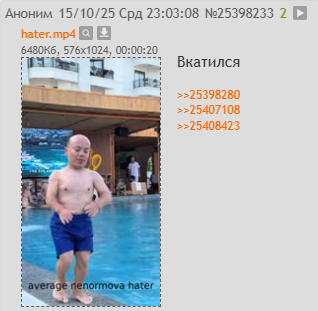 >>25450786 >Так и запишем, Педофилыч с Урала На него не похоже, тот пишет грамотно >Галядаун ненавидит апельсинку Он даже не упоминался в ветке, с чего ты так решил?