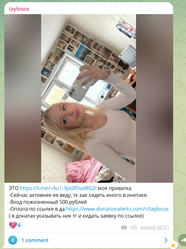 Своя картошка есть. Отопление через котёл, греющий трубы и батареи. Дрова и уголь купила за свой счёт (это всё озвучивалось на твиче в этом месяце). 29 в Китай. Едет на неделю. Цели не раскрывала, скорее всего имиджевые (сиськи делать не будет). Эти пять дней наверняка постримит из Красноярска и не раз