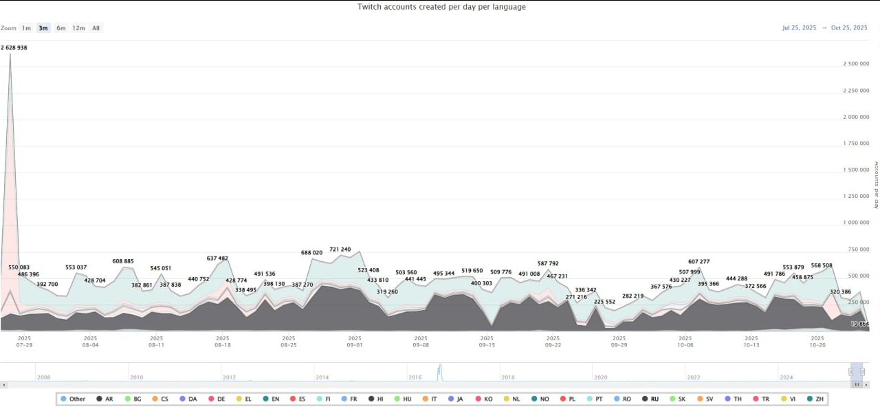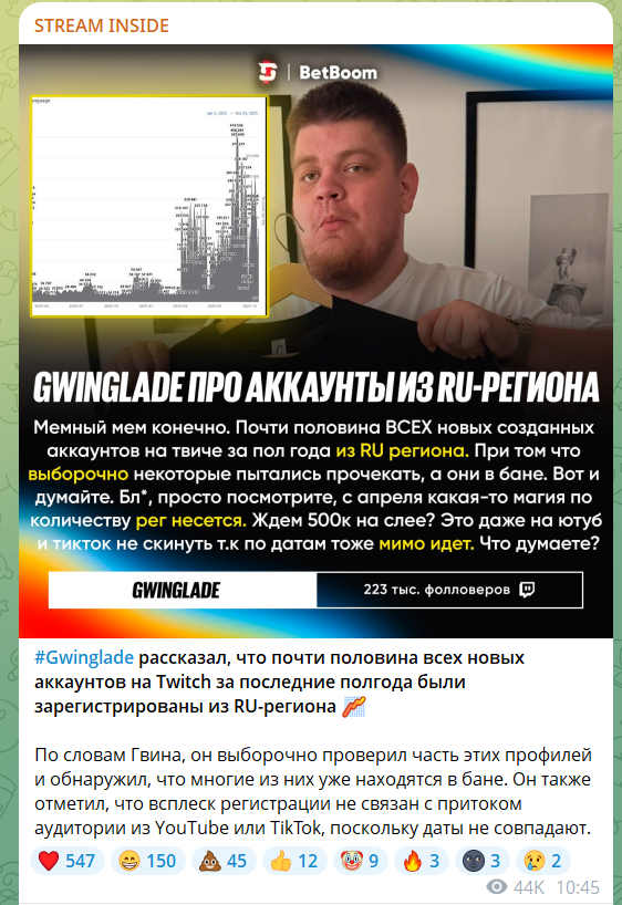 >>25460758 #Gwinglade рассказал, что почти половина всех новых аккаунтов на Twitch за последние полгода были зарегистрированы из RU-региона 📈