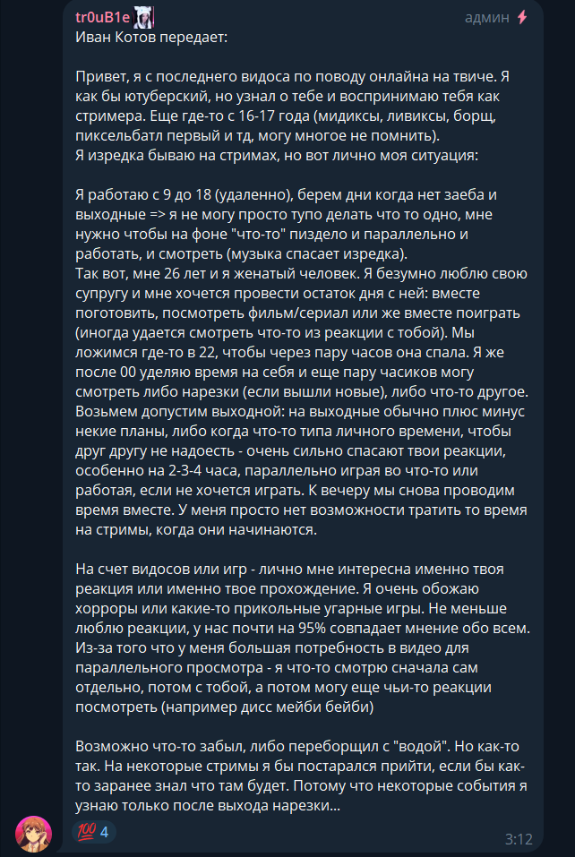 в-в-вова приивет слушай по поводу маленького онлайна у меня работа прости я вот работаю с 8 до 8 а потом жена пилит мозг с полкой и андрюша маленький плачет у него зубки прорезаются а я просто хочу пивка попить с друзьями а потом ещё ипотека нужно таксовать вечером прости вова я постараюсь обязательно присутствовать чаще где нибудь на работке подрублю где то в такси поставлю без звука прости вова буду что то с этим делать прости