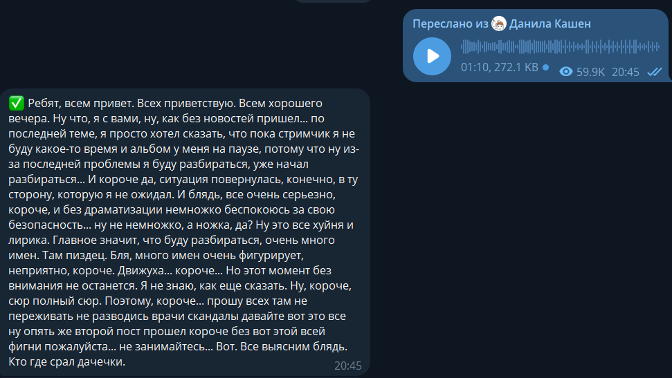 Вчера на стриме братишкин жёстко приложил Даню Кашина какими-то угрозами и пруфами, чё то в лс ему там отписал жёсткое. Сейчас Даня решил отменить временно стримы и прекратил работать над музыкой, так как боится за свою безопасность.