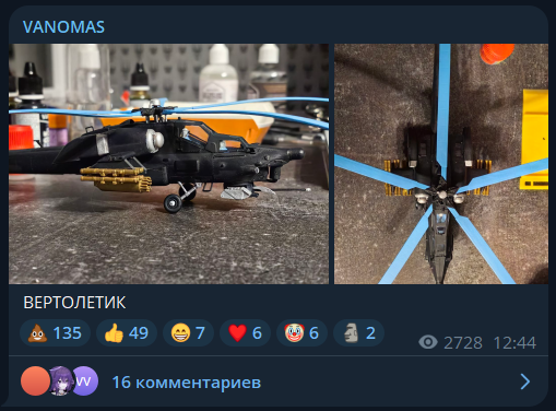 Уууу, 40летний дяденька собрал вертолетик за пол года, когда его ребенок максимум за пару дней покрасит и соберет, теперь год будет постить время от времени.