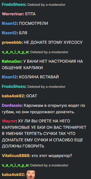>>25440645 И сделала ламповые стримы, а у ваномаса в чате полный бред творится, одни психи что-то пишут. А она по шуткам шизов выстегивает, пока тебе кажется, что это безобидна шутка, она уже тебе диагноз поставила и забанила. Кстати она ваномасу давно говорила, что нужно чата проредить, но он ее не послушал, остался наедине с такими же умственно отсталыми.