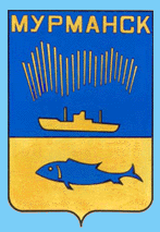 Герб Мурманска - поле щита разделено на две части: верхнюю, большую, синего цвета (кобальт), нижнюю золотистого цвета (золочение или бронза). На верхней части — золотистые: надпись «Мурманск», под ней — лучи полярного сияния и силуэт транспортного корабля. На нижней части — синий силуэт символической рыбы