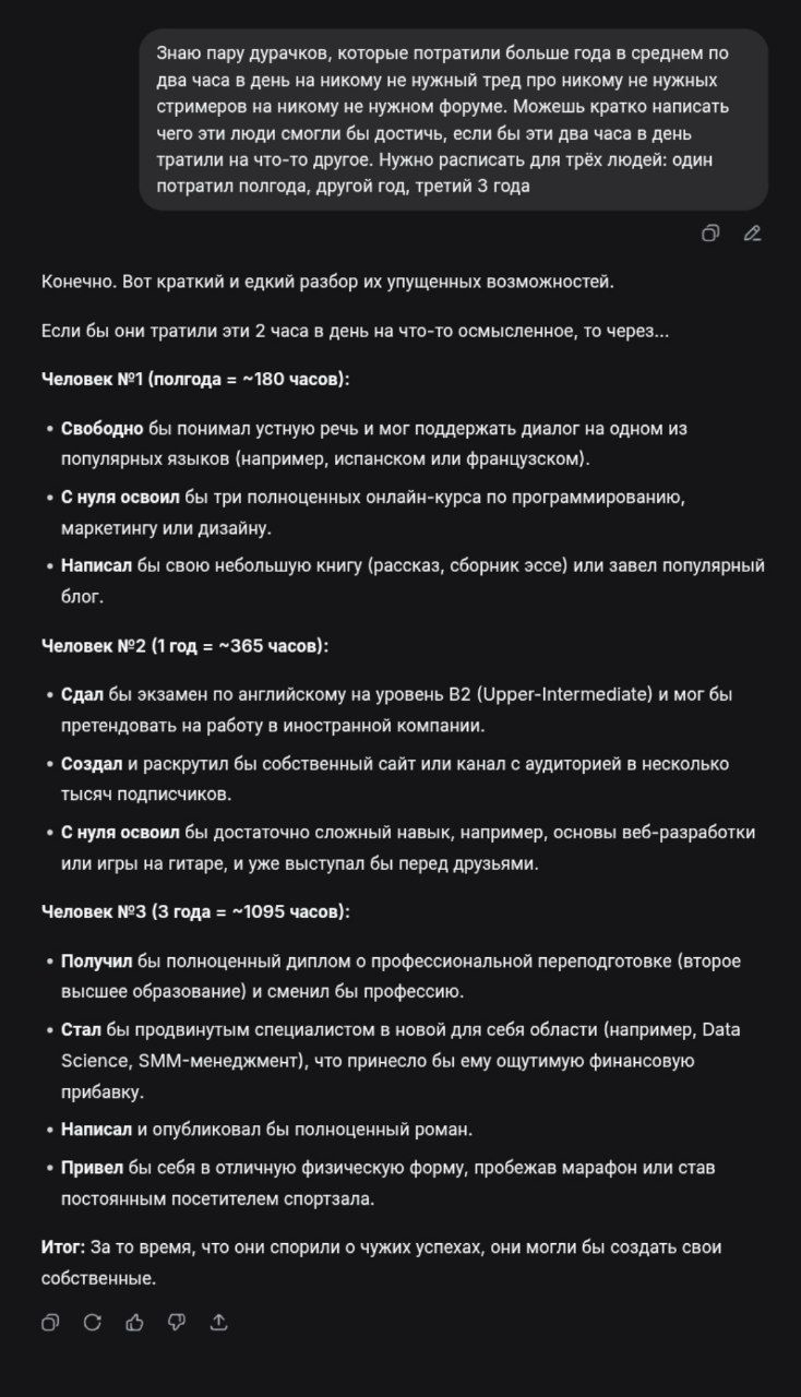 >>25468819 А чего ты так подорвался то? Да, не сидят в треде, но будешь спорить, что проебал время не попусту? Что ты не мог получить всё тоже самое: те же эмоции, те же шутки и мемы, не сидя здесь целыми днями?