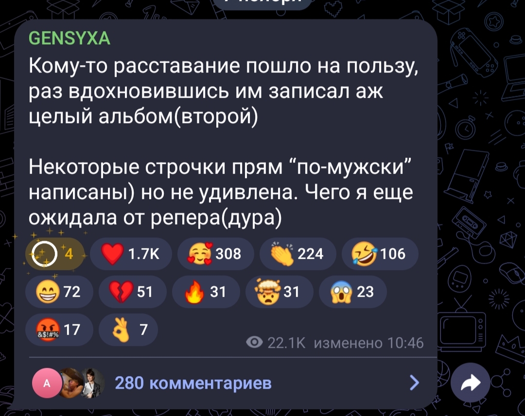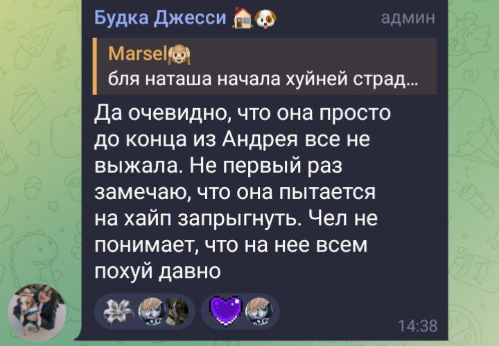 Ну а если серьезно, то удивляет, как натаху до сих пор все это задевает и так далее. Казалось бы, на внешность лысый карлик, пусть и успешный, но можно найти и получше, а она реализованная стримерша с ламбо, тем не менее, ведет себя как подросток и выливает все в тг уже не в первый раз
