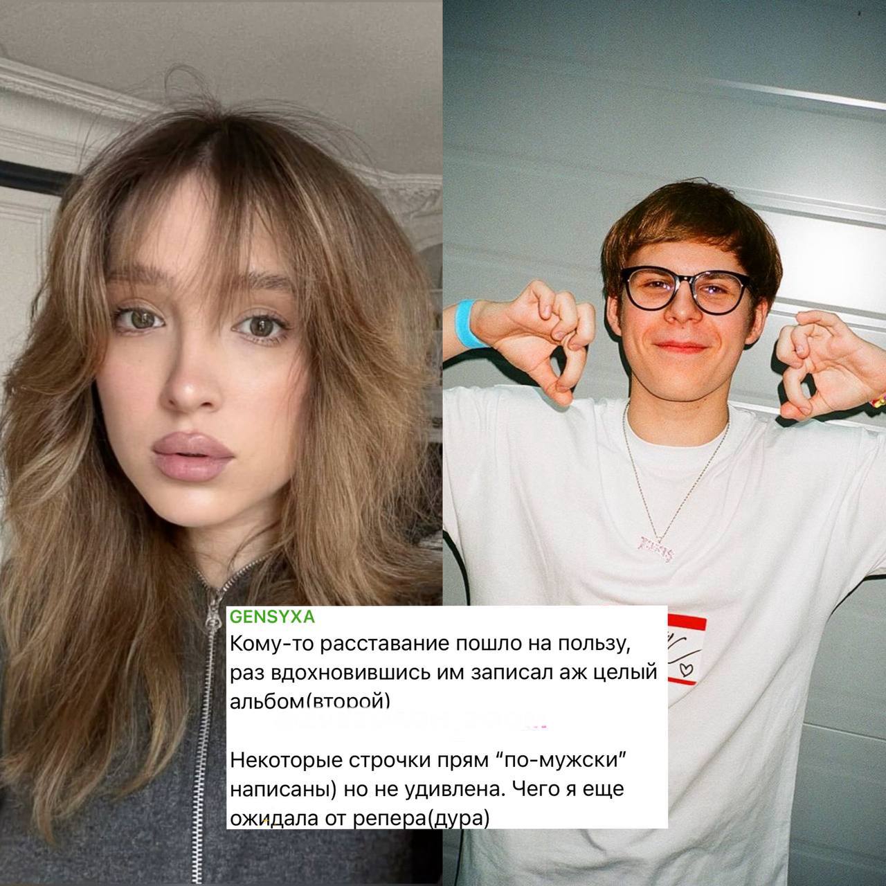 Сначала у генс был парень стример - который на стримах хвастался как трахал ее как и где только возможно Потом парень рэпер - который делает тоже самое в треках