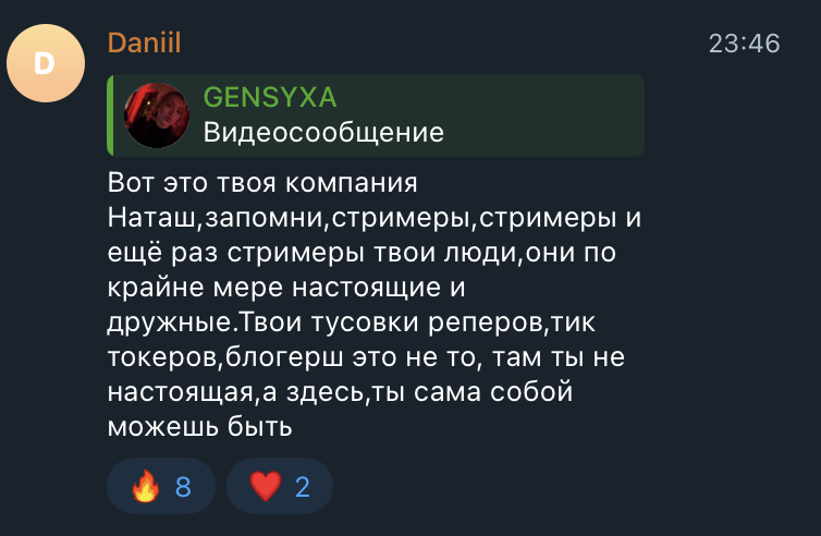 Настя на стриме высказалась по поводу их бифа и заявила, что она не конфликтный человек, но не могла молчать, когда задевают её близкого человека. Обвинила Наташу в намеренном хайпе и добавила, что она пиарится только на конфликтах и бывших, а не своих талантах. Продолжать отвечать больше не собирается.