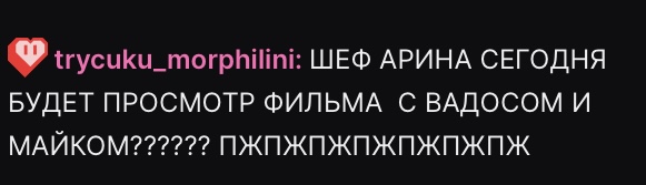 >>25539186 мне честно хуёво от вас симпо морфилины которые тут и в чатике по типу ильи джулеса репгеймера и прочих вот эти её отмазки и фразы на публику что б только её не хейтили "Вы ничего не знает тк всё это происходит на стримах и на самом деле вы не в курсе всей правды,вы придумываете себе в своей голове и всё" в итоге со слов носа мы слышим "да мы в дс вне стримов вообще не общаемся тк она не сидит и не хочет" то есть они даже если и переписываются каждый день как говорит арина то это только переписки и ей видимо мерзко с ним общаться хз
