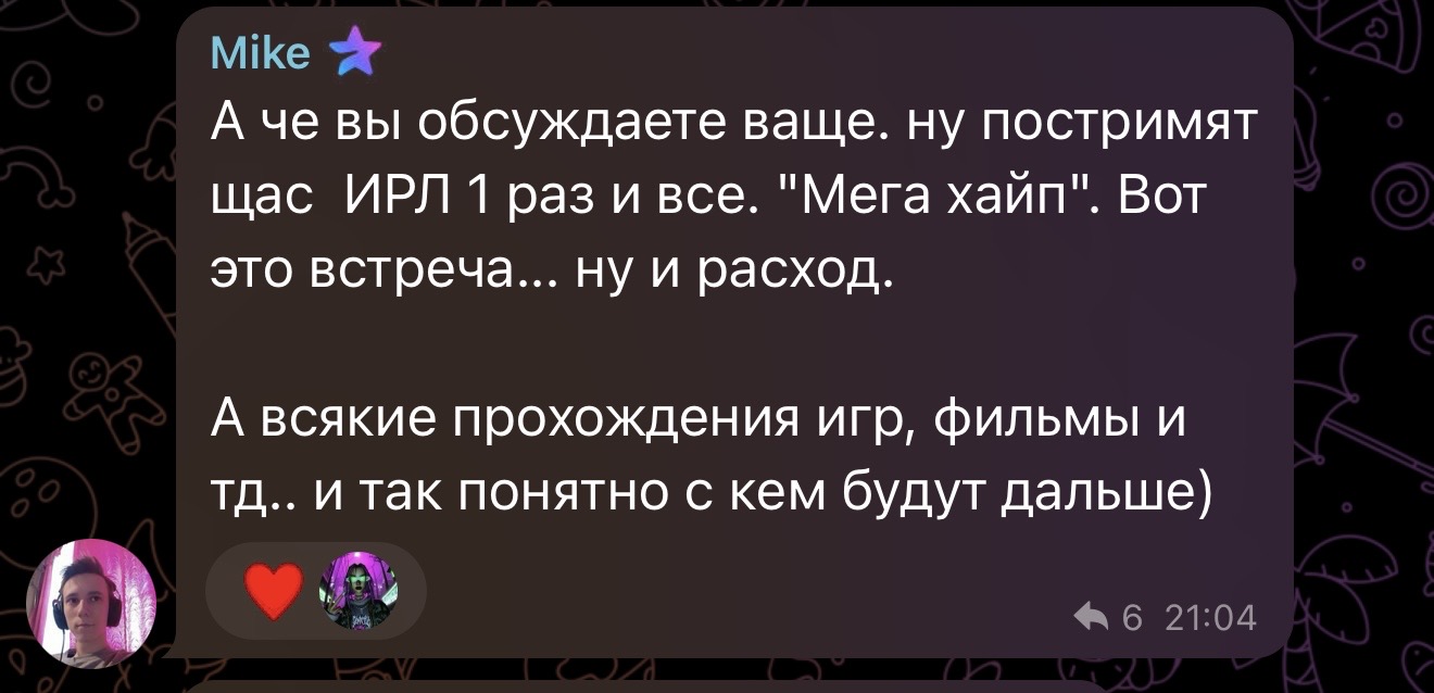 >>25547472 не, Наташа улетает уже завтра в 10 вечера и они больше не увидятся год-два до следующего чьего-то ДР. А на тот момент у кого-то из них появится пара и они уже не будут так вместе стримить