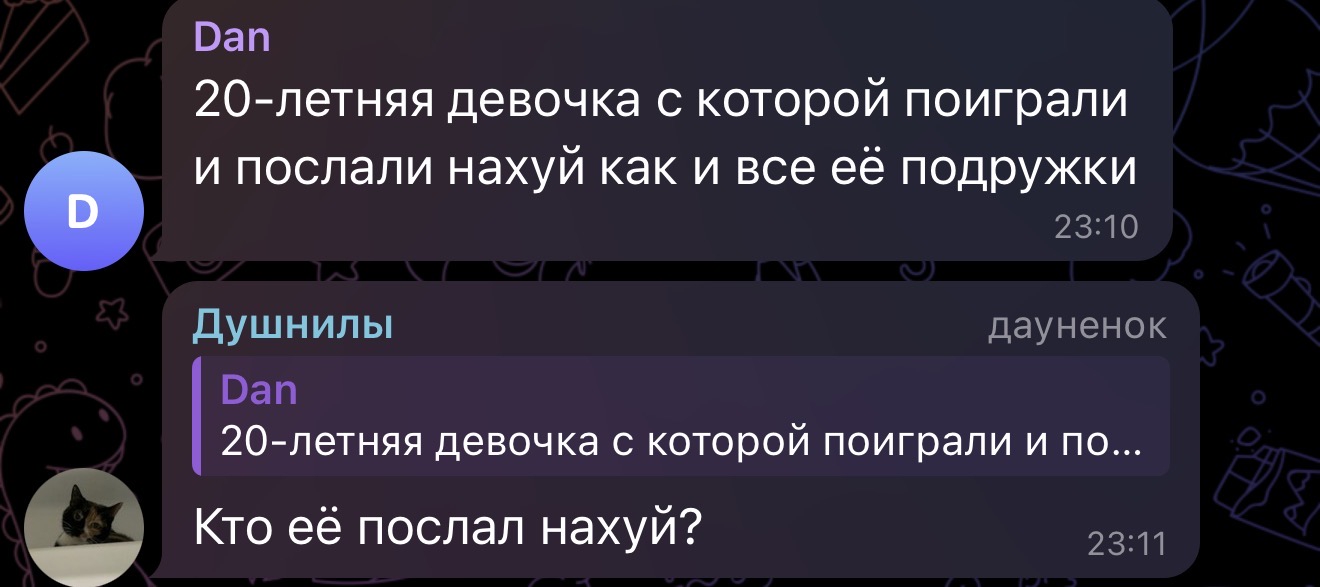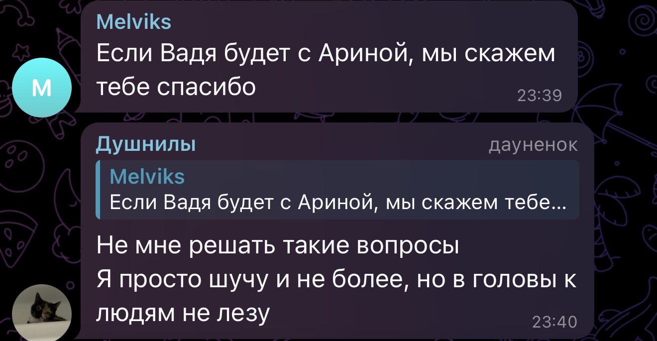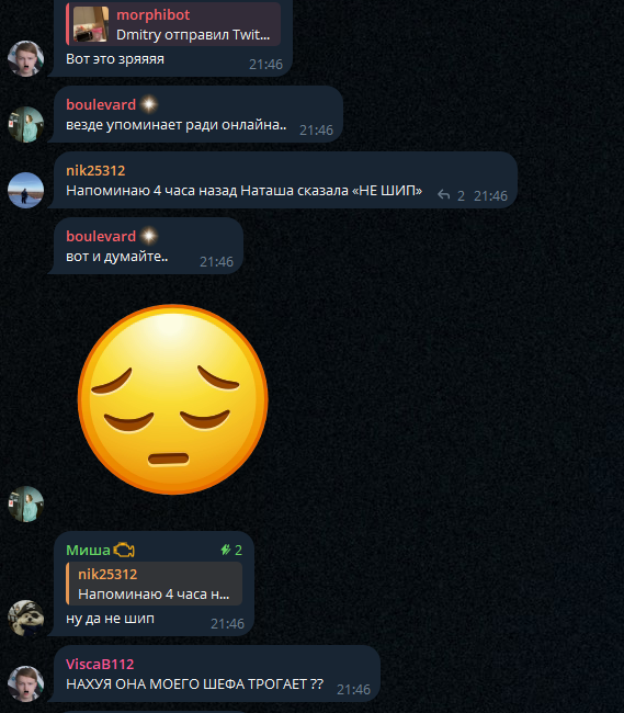 Я не понимаю суть чата Морфилины , они типо Вадима ненавидят? Просто они пишут что в итоге Наташа улетает в Москву и у них нихуя не будет, но с Морфилиной у них тоже нихуя не будет - как итог они желают зла Вадиму , они что отбитые?