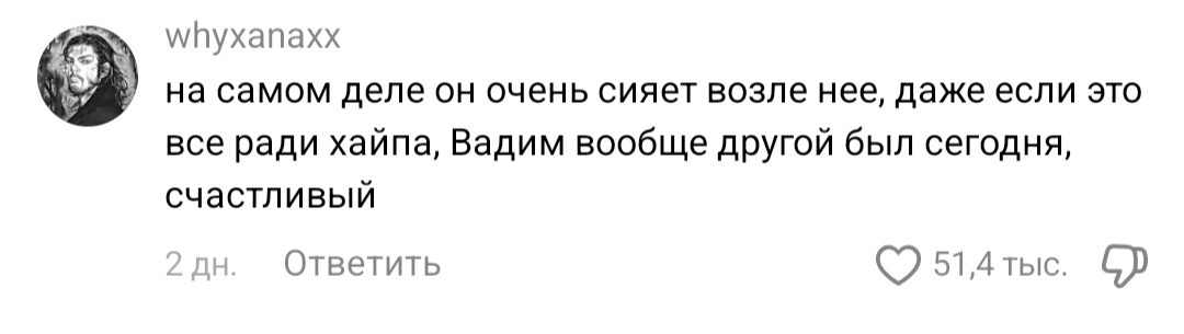 Сгорела на Вадима за то что он рассказал про часы, и что сказал всё неправильно Сказала, что дали вам контента с Вадимом и хватит Но при этом потом сказала, что контент только начинается (возможно шип с кем-то другим)