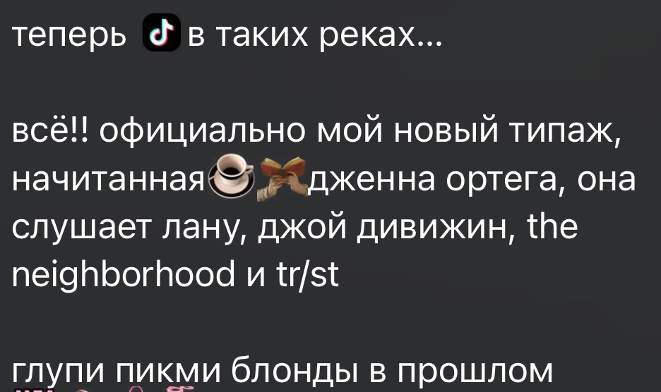 >>25540332 cлился очередной симп.. Чувак просто смирись, ну да, у тайбисокс обаз дома девственной няшки стесняшки чтоб угодить инцелам комнатным. Но в жизни она блядушка которую любой смазливый торч рэпер может снять при граммотном подходе. Её окружение это подтверждают что Алёна что Кристина говорили по пьяне, Валюшка любит и меф носиком пошмыгать и по хуям зумеров попргыать. Прими это как факт, увы но из деревенской девки которая приехала "заваёвывать Питер" не получилось сделать невинную домашнюю девочку ( особенно с такими подругами блять)