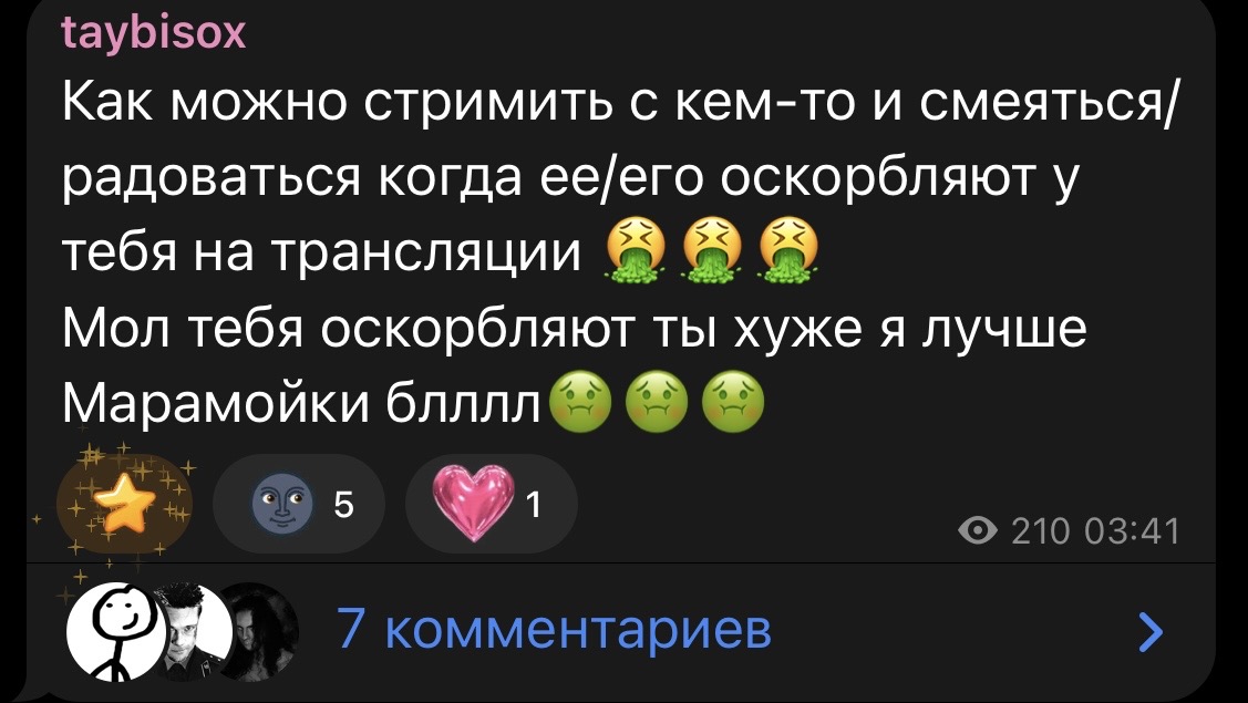 Раз уж на то пошло, то окружение у неё хуевое не то, что друзья сейчас, а все то, что было до: неудовлетворённые и обиженные, то симпы, то стримеры или шизофреники, то симпы, то стримеры или стримерши, то просто дегенеративные существа, что из себя ничего не представляют - только у таких появляется желание очернить честь светлого лучика добра.