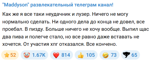 Как же я все таки неудачник и лузер. Ничего не могу нормально сделать. Ни одного дела до конца не довел, все проебал. В пизду. Больше ничего не хочу вообще. Выпил щас два пива и полегче стало, но все равно даже вставать не хочется. От участия хпг отказался. Все кончено.