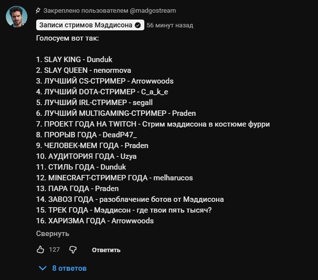 Почему мэдисон всегда пытается идти против системы Очевидно никто из его списка и близко не достоин премии SLAY Зачем эта попытка, почему не выбрать объективно хороших стримеров достойных? Обязательно выделываться? Или это очередная попытка привлечь угасающее внимание?