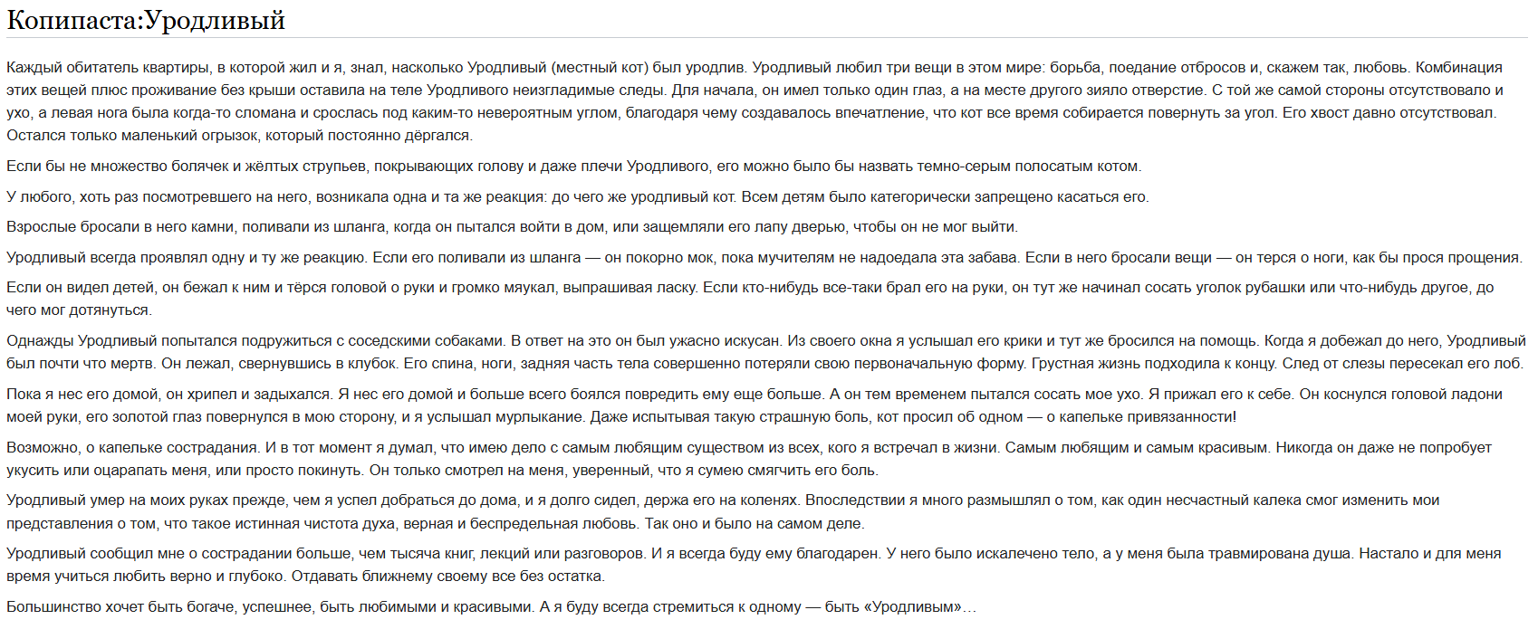 Ребят, вот у вас же у всех красивые коты? Ну, там, с окраской прикольной, супер пушистые, с добрыми глазами. Ни у одной тяночки не видел уродливого кота, а ведь они существуют. Вот прикиньте родиться таким уродливым котом. Вас ведь никто домой не возьмет.