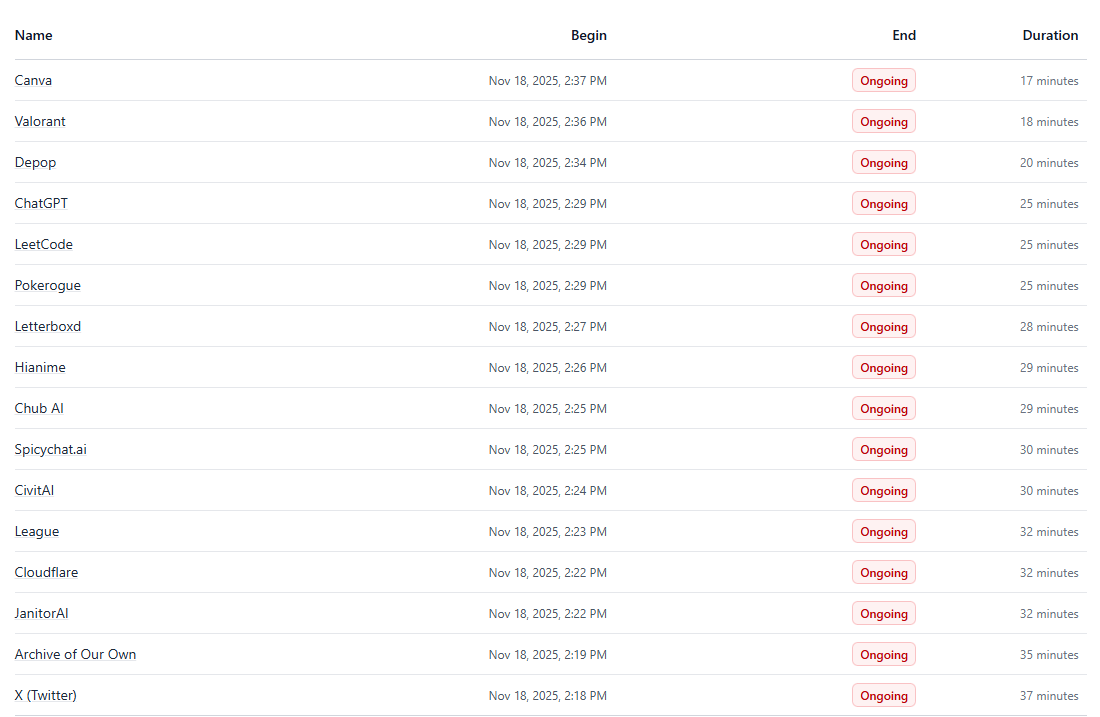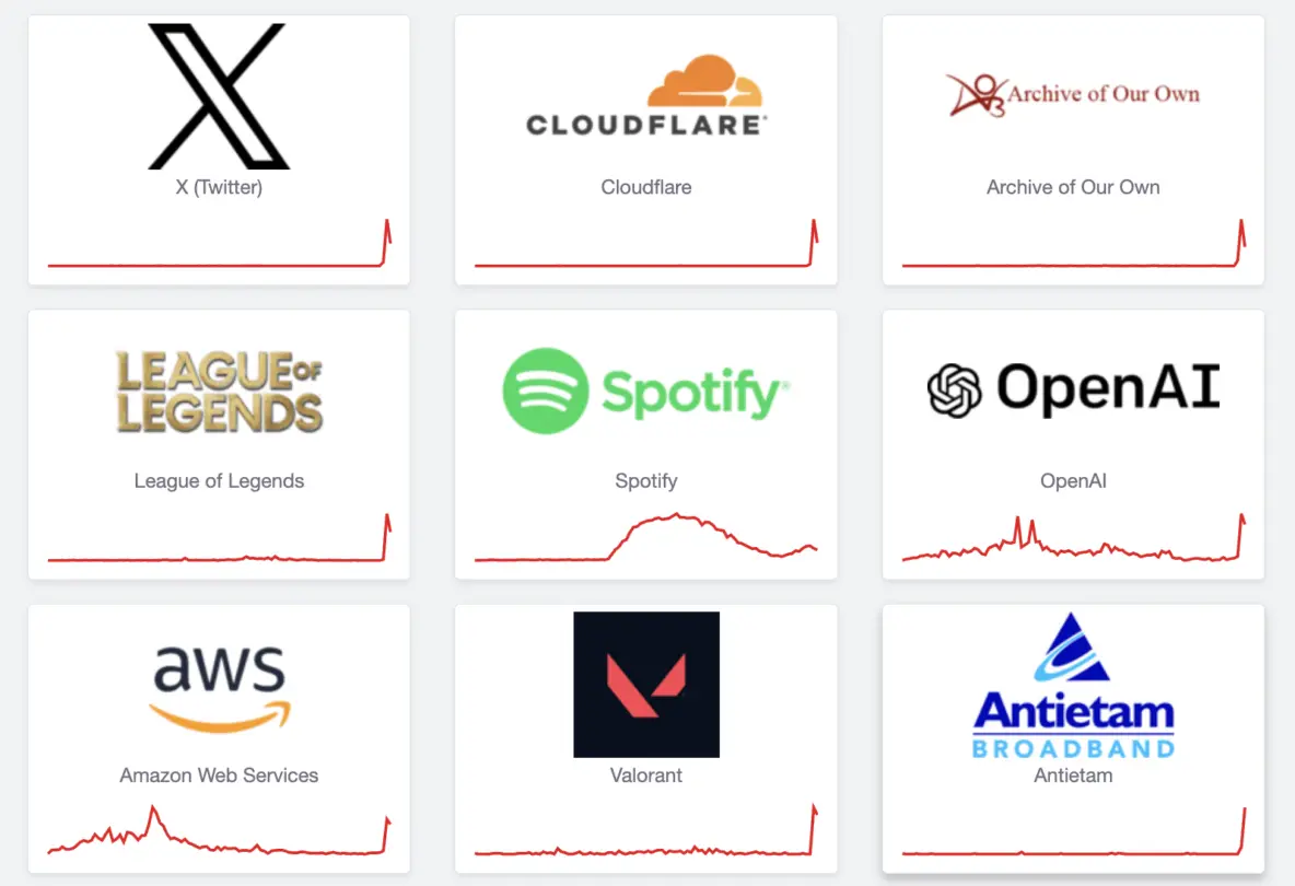 Согласно данным на платформе мониторинга сбоев Downdetector, пользователи массово жалуются на работу соцсети X, стримингового сервиса Spotify, некоторые сообщают о недоступности ChatGPT и игр Epic Games.