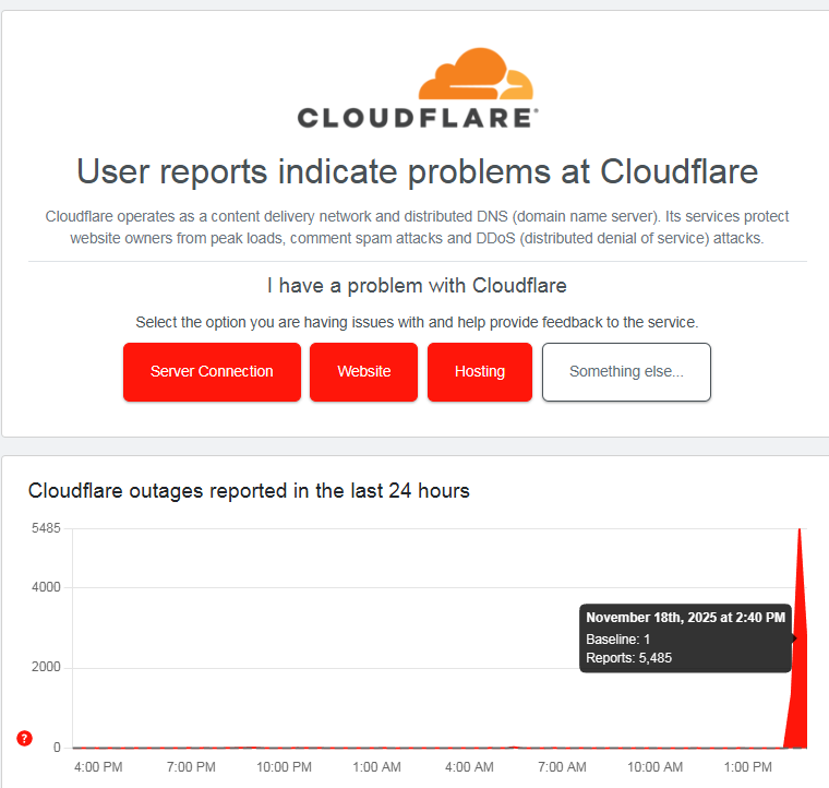 О сбое Cloudflare сообщила около 14:30 по московскому времени. Его причины выясняются. Пользователи по всему миру сообщают о проблемах с доступом к X, AWS, Spotify, Epic Games, ChatGPT, Claude и других сервисов, следует из данных Downdetector. Сам сервис сообщений о сбоях также работает с перебоями. В России жалобы поступают на работу X, ChatGPT и Janitor AI, а также игровых сервисов Facit, Leage of Legend и Valorant.