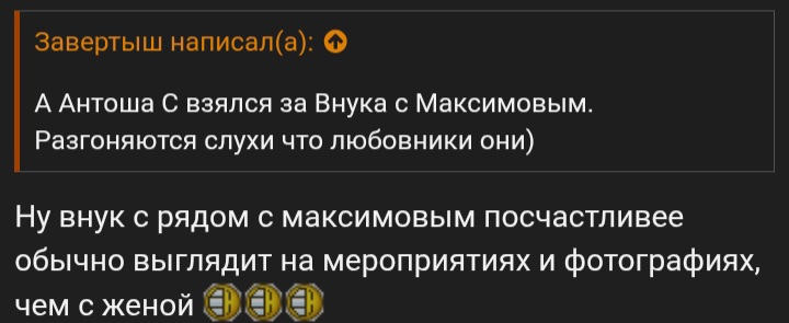 Я ваще в ахуе, что они раньше так открыто все делали у нее на глазах прямо и у всей страны причем, пилить кружки на 3 ляма охватов из одной постели в одном номере в 2 часа ночи с давящимися смешками, как школьники на задней парте (хотя 1 из них и есть школьник лоооол), а слепошарая куколдиха нихуя не понимала и не замечала типа и все молча глотала, как и продолжает жрать говно до сих пор, но щас они якобы осторожны, хотя по своей же тупости и невнимательности выдают себе ещё позорнее))