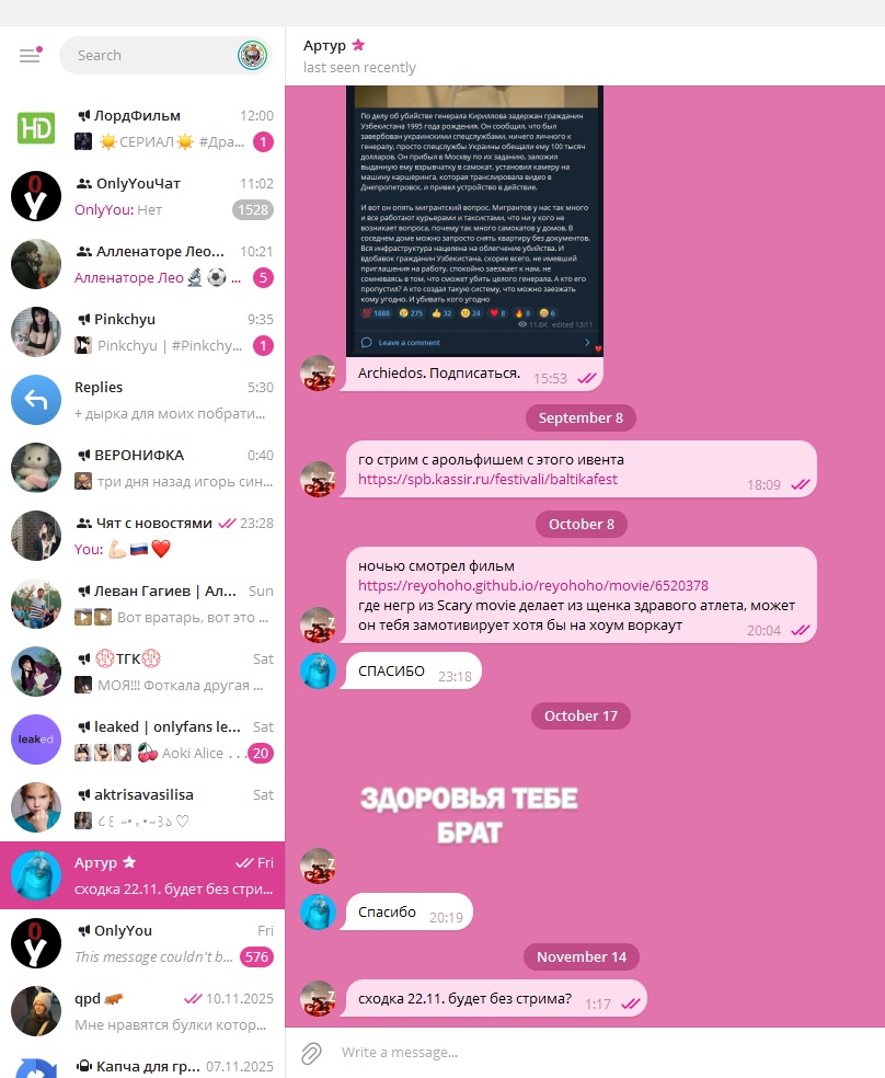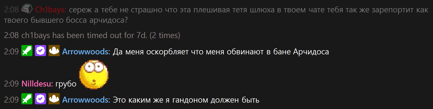Когда появились всякие килычи и арольфреши то он аж с облегченным голосом выдыхал подговаривая " фух блять... долбаебов отсеил.. " а по итогу все норм зрилы ушли к подсосам арчидоса, а остались у него тупые дебилы-шейхи которых он терпеть не может и с которыми поговорить нельзя ни на какую тему, просто терпит их ебаные фильмы никому ненужные и нормисный чат без шизов которые давно у килыча сидят
