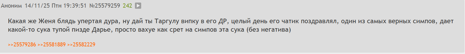 >>25600695 Вот ещё одного спалили, Таргул в тредике. Сначала сам про себя написал, что сука випку не даёт на его день рождения, теперь радуется и хвастается, что в привилегированные занюхи перевели, порядочному тредовскому по хуй на дарий и таргулов, занюхивать за занюхами только сами приваточные будут