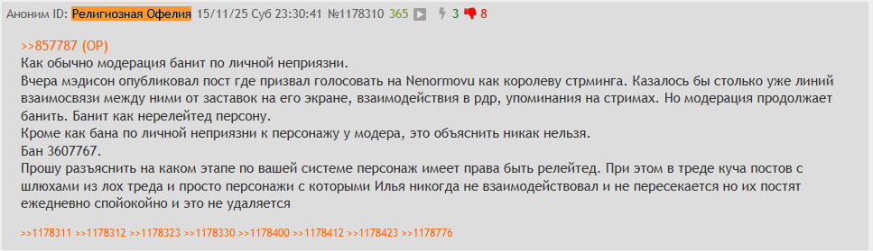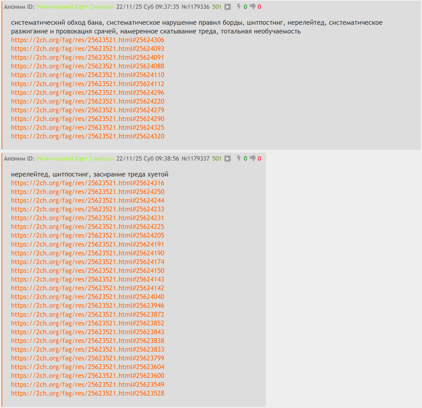 >>25624320 >>25624332 >>25624341 >>25624368 >>25624434 >>25624453 >>25624475 >>25624510 >>25624538 систематический обход бана, систематическое нарушение правил борды, шитпостинг, нерелейтед, систематическое разжигание и провокация срачей, намеренное скатывание треда, тотальная необучаемость