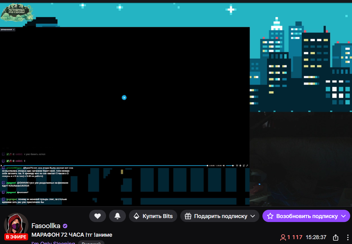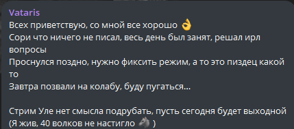 в чем шиза, что он до марафона после игр в дискорде офал комп до одиннадцати, через полчаса заходил и по 2 часа включал эту хуйню. Как марафон начался, запустил эту игру на стриме, начал её настраивать, следовательно, запускал не на своём компе. И начались ночные посиделки и игры до поздна в дискорде во время марафона. Как он закончился, вчера, он поставил на скачку гта, оставил стим включеным и не вышел с дискорда, до сих пор в спящем режиме. Сегодня на весь день пропали, появились в одно время после ирльных дел, он запустил игру, хотя мог бы в кс поиграть в дс, она лигу и вышли в одно время, только со стима он не вышел, как и с дискорда, потому что дома комп включен, а он у нее