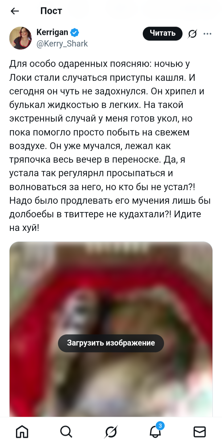 >>25625671 Блять, сука ты ебаная , у меня слезы пошли. А я уже не ребенок далеко. Помню, кот лет 10 жил и заболел под конец. Тоже на усыпление повез, а он в последний день как-то успокоился, ко мне пришёл, лег на руку и замурлыкал. Ревел как сука. И в больнице чуть не прорвало, еле дотерпел до машины. Потом пил дня три. А Хуяна блять ещё твиты пишет веселые, хохочет, "ыыы фаршекаши экономия, ыыы высплюсь". Бессердечное создание. 0 эмпатии. Просто социопатка. Ни к кому жалости не испытывает, кроме себя. Вечно показушничает. Какая же скотина, тьфу. И таких на свете дохуя, увы.
