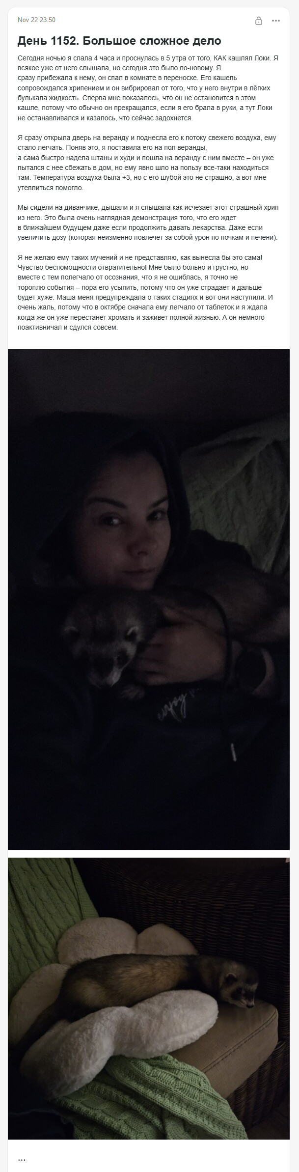 >>25634435 Тогда соболезную Яне, такая неприятная помеха от вкатывание в цифровое номадство осталась, но ничего, опыт уже есть с этим получется лучше, без вот этих бессоных ночей и трат на лекарства. Будет как-то так: "Мы обсудили всё с Бенни и решили что ему будет лучше если его усыпят"