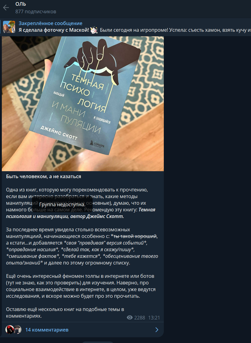 Я скинул Оле (жена Юзи) скрины с двачей, где пояснялось, что эта книжка нейрослоп. Но она удалила комментарий и забанила меня. Почему так? Ей не хочется узнать правду? Она же там топит за манипуляцию, хочет почитать книги про манипуляции в СМИ и т.д., я думал ей будет интересно добраться до истины любой ценой, но она предпочитает жить в иллюзии.
