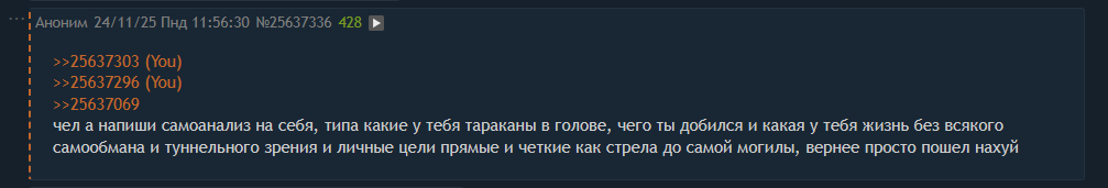 >>25637303 >>25637296 >>25637069 чел а напиши самоанализ на себя, типа какие у тебя тараканы в голове, чего ты добился и какая у тебя жизнь без всякого самообмана и туннельного зрения и личные цели прямые и четкие как стрела до самой могилы, вернее просто пошел нахуй