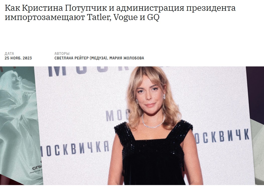 В середине ноября в московской галерее Vladey прошла презентация глянцевого журнала «Москвичка». Его выпустило «Издательство редких книг» (ИРК), основанное пропагандисткой Кристиной Потупчик — бывшим пресс-секретарем прокремлевского движения «Наши» и владелицей крупной сетки провластных телеграм-каналов.