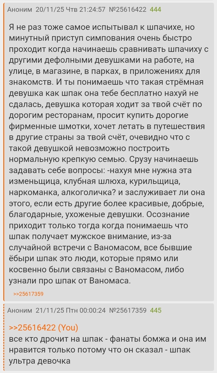 Я не раз тоже самое испытывал к шпачихе, но минутный приступ симпования очень быстро проходит когда начинаешь сравнивать шпачиху с другими дефолными девушками на работе, на улице, в магазине, в парках, в приложениях для знакомств. И ты понимаешь что такая стрёмная девушка как шпак она тебе бесплатно нахуй не сдалась, девушка которая ходит за твой счёт по дорогим ресторанам, просит купить дорогие фирменные шмотки, хочет летать в путешествия в другие страны за твой счёт, очевидно что с такой девушкой невозможно построить нормальную крепкую семью. Срузу начинаешь задавать себе вопросы: -нахуя мне нужна эта изменьщица, клубная шлюха, курильщица, наркоманка, алкоголичка? и заслуживает ли она этого, если есть другие более красивые, добрые, благодарные, ухоженые девушки. Осознание приходит только тогда когда понимаешь что шпак получает мужское внимание, из-за случайной встречи с Ваномасом, все бывшие ёбыри шпак это люди, которые прямо или косвенно были связаны с Ваномасом, либо узнали про шпак от Ваномаса.