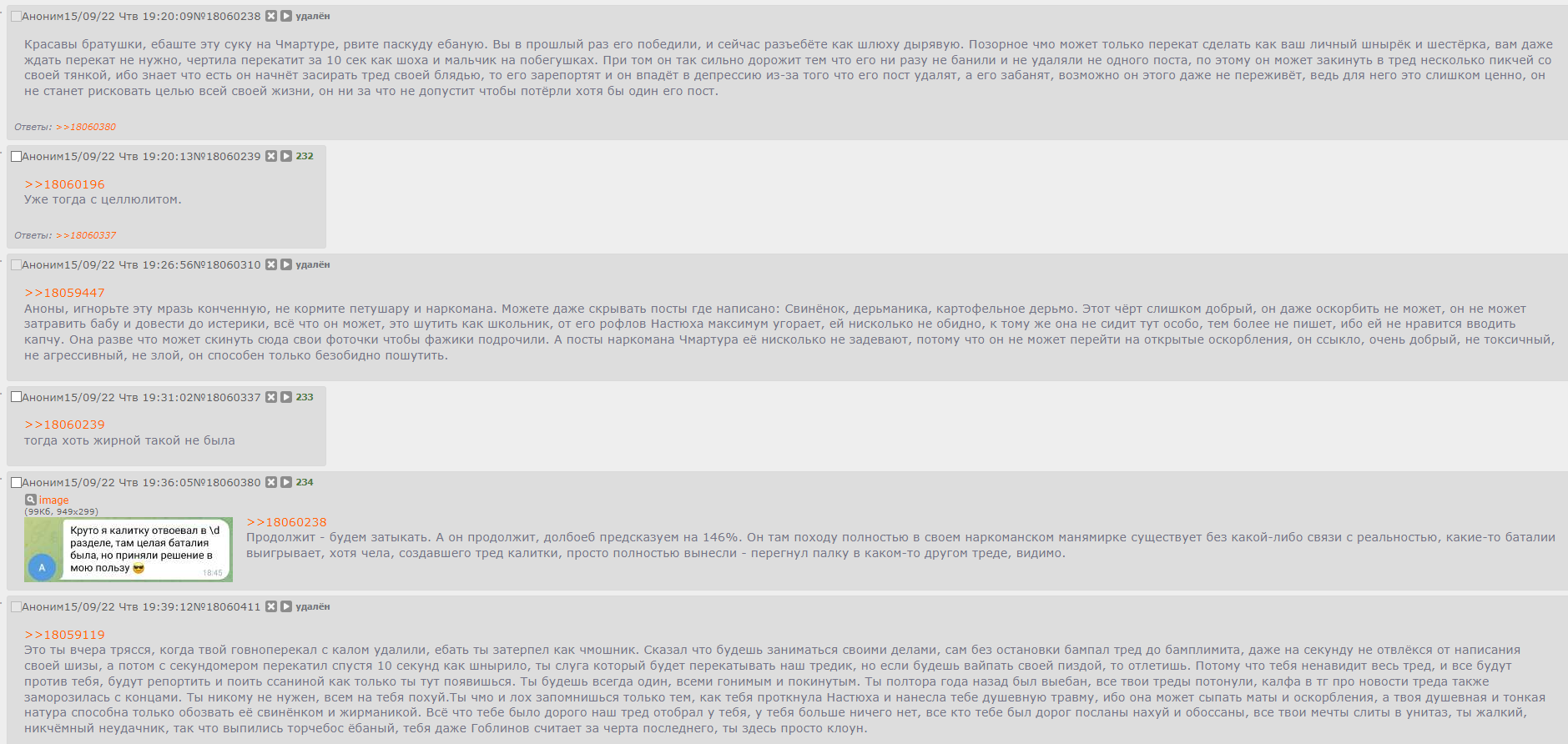 Чмартур не сидит в треде с конца 20-го, он тогда психанул на Граблю и ливнул с двача. Он изредка попёздывает у носатого в калфе, даже в чатах стримерш не сидит.