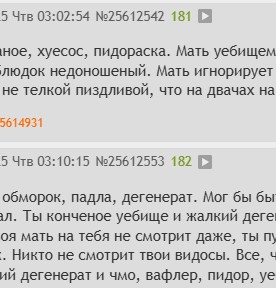 Кокичмо ебливое, недоумок, пидорас, хуесос. Мать его рожала, мучилась, а он ее уебищем называет. Выродок поганый, ты хуже алкаша в сто раз, который отца довел. Мразь, пидор, паскуда, недоблогер-дегенерат, чтоб ты в дурке свои дни окончил, вырожденец ебучий