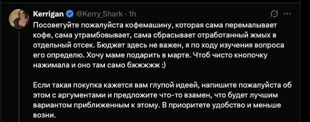 А тем временем кекяна просит чтобы за нее выбрали кофемашину, пиздец какой же надо быть тупой чтобы не осилить это делать. Тем более она давно ведь уже всякие девайсы использует для приготовления кофе, я хорошо помню как она покупала ебучий рожок, потом аэропрессор, потом кофемашину которая заваривала из капсул кофе и она что реально не шарит после всего этого что купить мамке?