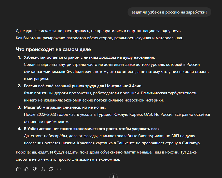 >>25653602 Ты туп, Узбеки ездят в основном в Москву а это не Россия. А вот Таджики ездят по всей России, вот спроси про это джипити чат. Насчет Казахов и Кыргызов я оказался прав, и тут тоже буду прав.