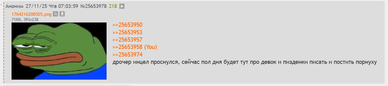 даун треда >>25654500 сам начинаешь это говно сюда нести и доказывать что-то своими неумелыми тейками по типу написал анар и нашло актера, а потом начинаешь визжать, когда тебя тыкают в обсер твой