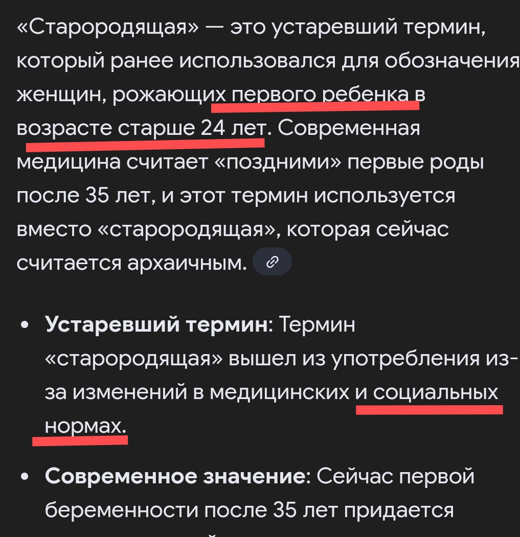 В базовом ссср кстати старородящая была в 24 года, но после распада приняли куколдскую финистскую западную модель и подняли до 35, на заметку, большинство стримерш по базовым стандартам прошлого это неликвидные старухи, которые вам родят ромку прыгуна или как минимум не оч здорового и красивого ребенка из за мутировавших с годами яйцеклеток