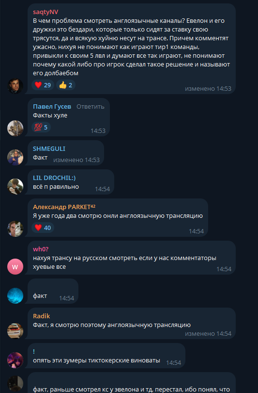 >>25689940 >>25689954 Человек буквально дал конструктивное мнение, которое вполне объективное, но занюхи жида все всегда навешивают ярлыки. У вас вообще нет критического мышления и все вокруг только обиженки? В чем он не прав? Комментирование всегда было стандартизированное, а это залипание с диалогами про дрочку и сперму зафорсил жид и ко. Если смотреть трезво, а не через призму «ыыы вадос топ и легенда», то это ультра кал, что онлайн только подтверждает. Быдло и школота наворачивает будь здоров, сомневаюсь, что кому-то из адекватных людей, следящих за киберспортом, будет интересно смотреть этот пиздец
