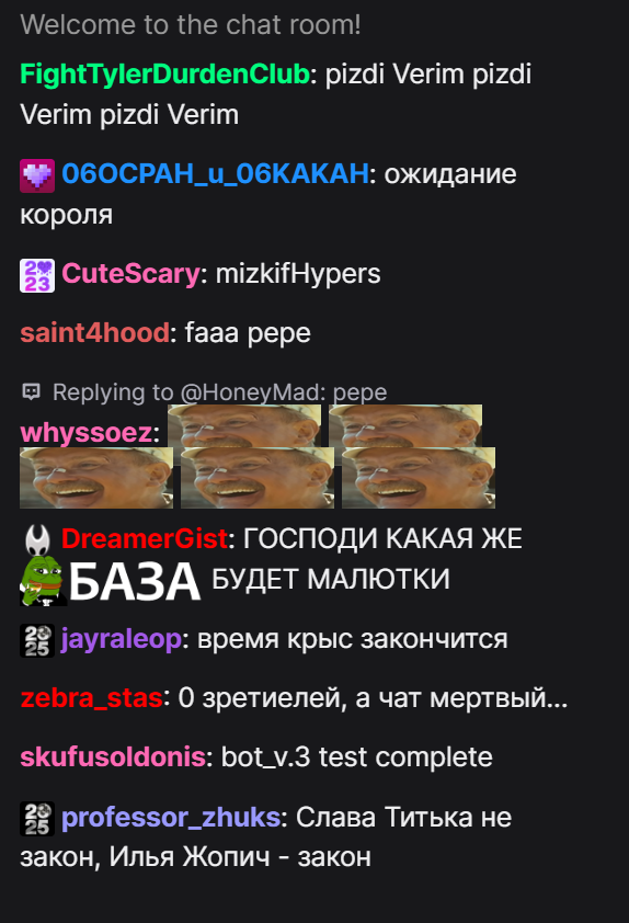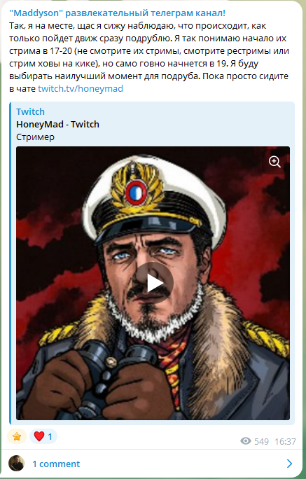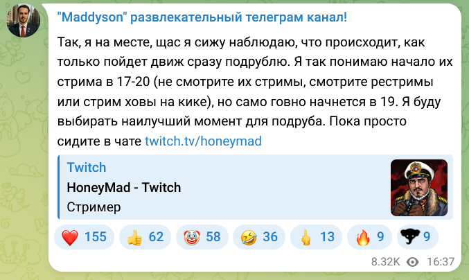 Так, я на месте, щас я сижу наблюдаю, что происходит, как только пойдет движ сразу подрублю. Я так понимаю начало их стрима в 17-20 (не смотрите их стримы, смотрите рестримы или стрим ховы на кике), но само говно начнется в 19. Я буду выбирать наилучший момент для подруба. Пока просто сидите в чате twitch.tv/honeymad