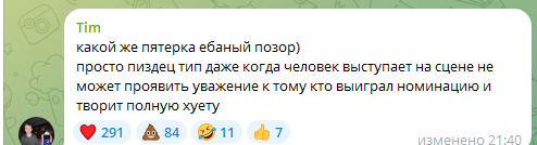 -чмодье сошел с ума, сделал фрик шоу, позвал БУКВАЛЬНО тотал уродов, рыжий слизень пробил очередное дно, хуже ее уже никого нет -потом после самой премии хотя бы реабилитировался, сделал разговорный, норм -ряженые пидарасы с накруткой вручили премии своим же друзья в очередной раз, ничего нового, все в ахуе с кала, бабки буков пилятся, цифры онлайна крутятся