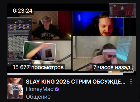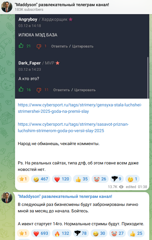 Здравствуйте уважаемая Екатерина Михайловна,скорее всего вы видели что 03.12.2025 проходила уже ежегодная стримерская премия "SLAY AWARDS" , которая транслировалась на Twitch канале самого популярного Русского стримера Вячеслава Buster'a Леонтьева, так вот,в одной номинации,а именно "Проект Года" выиграл Турнир по компьютерной игре Counter Strike , который организовывал Украинский стример Вадим Evelone Козаков, донативший множество раз на помощь недружественной стране (все видеоматериалы и подтверждения во вложениях ниже). Так вот,как это так получается,что на главной Стримерской Премии России выигрывает такой человек.Партнёрами данной премии выступает Букмекерская контора WINLINE,Ростелеком,Гигачад и прочее.Прошу проверить данные материалы и данную информацию и принять меры.Кроме самого Вячеслава Buster'a Леонтьева который выступает просто как лицо премии,главная фигура в организации является Павел Rikkidi Гусев, по совместительству Руководитель "Stream Alliance"